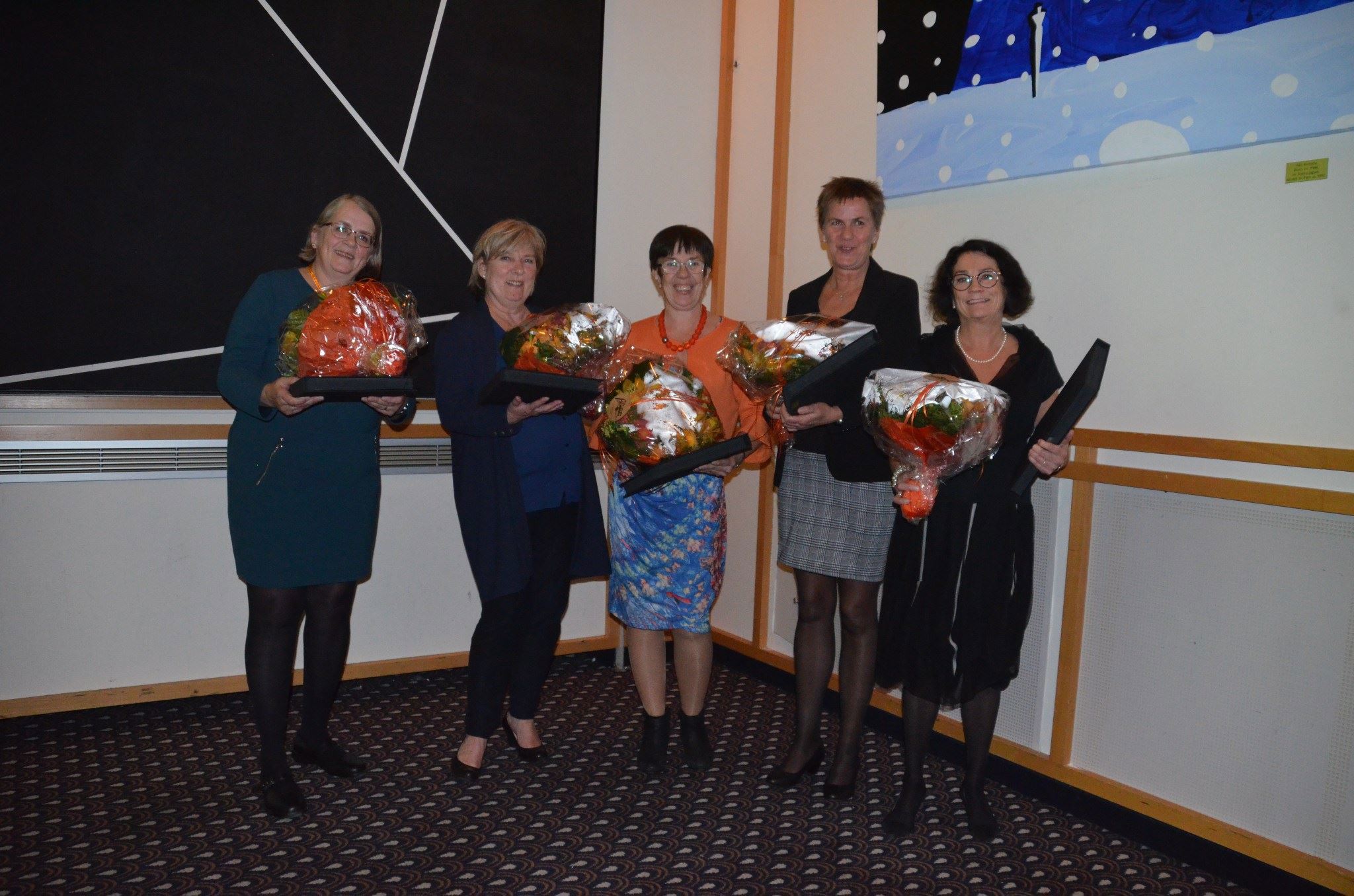 På bildet over kan dere se våre 5 jubilanter som i år har 30-årsjubileum i Mobarn. Fv. Gerd Malvik, Eydna Riksfjord, Sonja Gjelsten, Torill Vaseng og Marie Løkvik. Disse fikk utdelt medaljen for lang og tro tjeneste til stor applaus. Medaljene tildeles av Det kongelige norske selskap for Norges Vel.